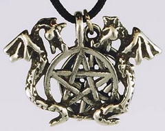 Product Descrpition: A powerful talisman, the twin dragons pentagram portrays two winged dragons on either side of a pentagram as a sacred symbol of power and protection. With the dragons representing the mysteries and powers of the universe, the pentagram itself is a time honored symbol representing the elements mingled with the mind, or the spirit, resulting in oneness with the universe. Measuring 1"wide and 3/4" long, the pendant has beens culpted of pewter and is accompanied by a solitary, interwoven pentagram charm upon its black nylon cord.