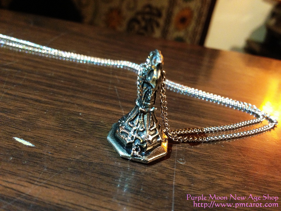 Reproduced from the Goetia, the famous magickal Grimoire of Solomon, this functioning wax seal is reputed to be able to cause love between and man and a woman, raise thunder and lightning and give answers to all things secret and divine. Crafted in English pewter and supplied with a detailed leaflet giving a Ritual of Empowerment (and disempowerment), it is supplied with a lovely, black velvet drawstring keepsake pouch and an 18" link chain.