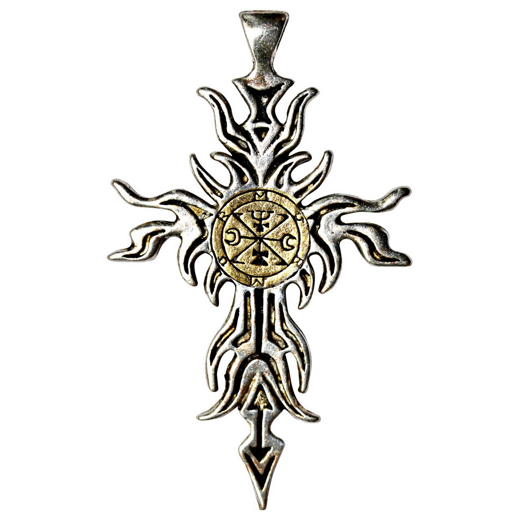 Based on the Sigil of Zagan from the Goetia of Solomon, this cross is reputed to make the wearer witty and to bestow upon him or her the power to turn water into wine, metal into coins and even make fools wise. For transformation Crafted in English pewter, enhanced with hand applied gold plating and supplied with a detailed leaflet giving a Ritual of Empowerment (and disempowerment), it is supplied with a lovely, black velvet drawstring keepsake pouch and an 18" link chain.