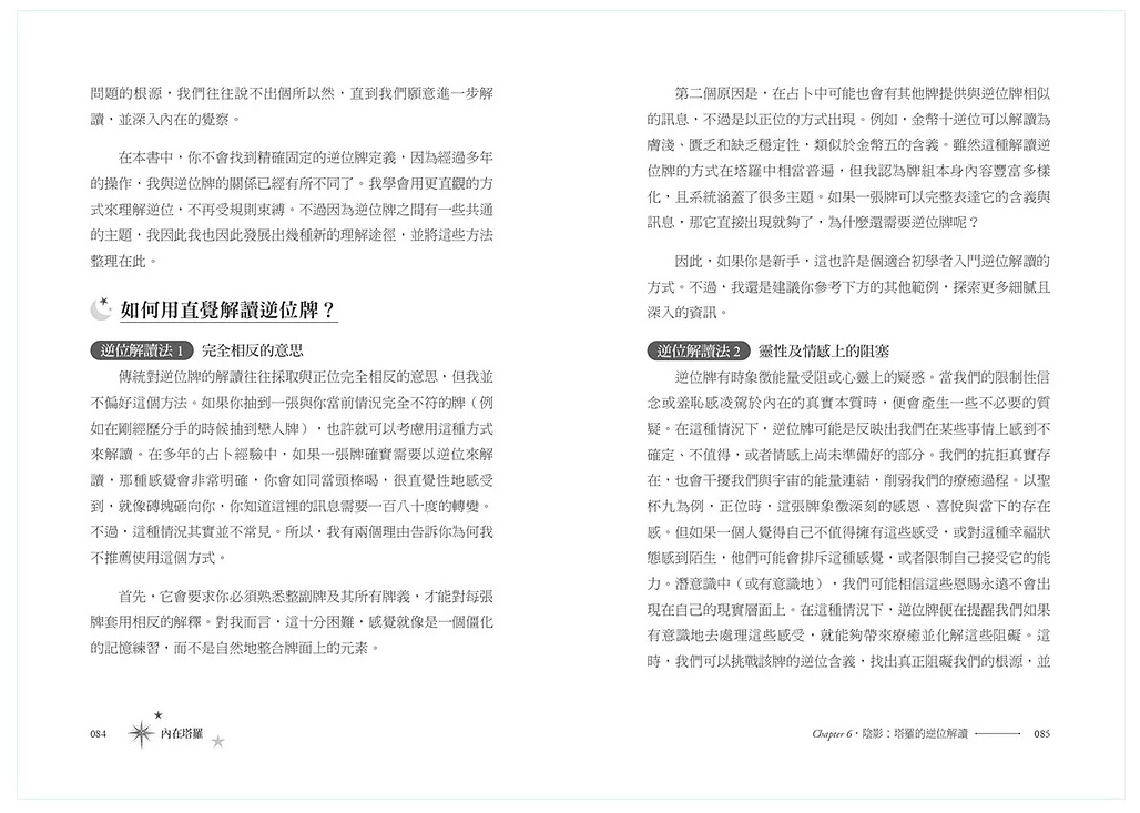 ◎ 詳細解說塔羅知識,包括牌卡結構、數字象徵、牌陣設計、逆位解讀,滿足初學者與進階讀者需求。
