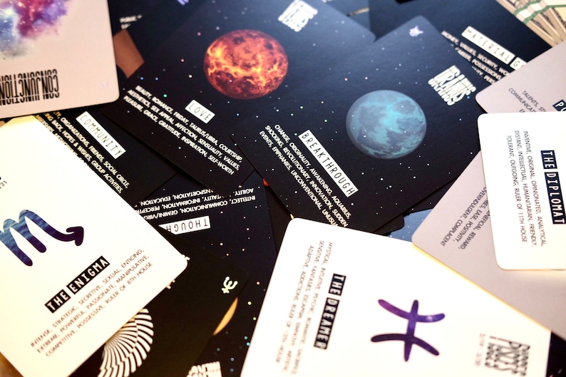 Product Descrpition: A unique and versatile 47-card astrology study guide/oracle deck that can be used in a multitude of ways. This deck is separated into four different categories: The Zodiac, Planets/Cosmos, Aspects and The Houses. It is a perfect way to learn more about yourself by using this with your natal chart. The themes on the card allow this to serve as an effective oracle deck to gain clarity on any aspect of your life. Additional ways this deck can be used are understanding current transits, using with tarot to better understand archetypes (ex: The Emperor - Aries as the associated zodiac sign, as a study guide to learn about astrology in general, and more.
