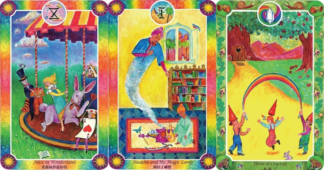 例如「灰姑娘」是傳統塔羅牌中和夢境與預示靈通力有關的「月亮牌」;「睡美人」則對應到塔羅牌中的「死亡牌」,因為兩者都具有個人轉化重生的意涵;「小紅帽」是塔羅牌裡的「愚人牌」,而「大野狼」是「惡魔牌」。