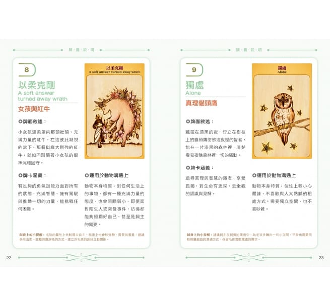 詳細牌義說明,用法具體明確,逐張說明44張牌卡涵義,讓你熟悉每張牌卡特色。使用方法配上圖解,淺顯易懂。另外也提供飼養上的小提醒,給飼主具體建議。