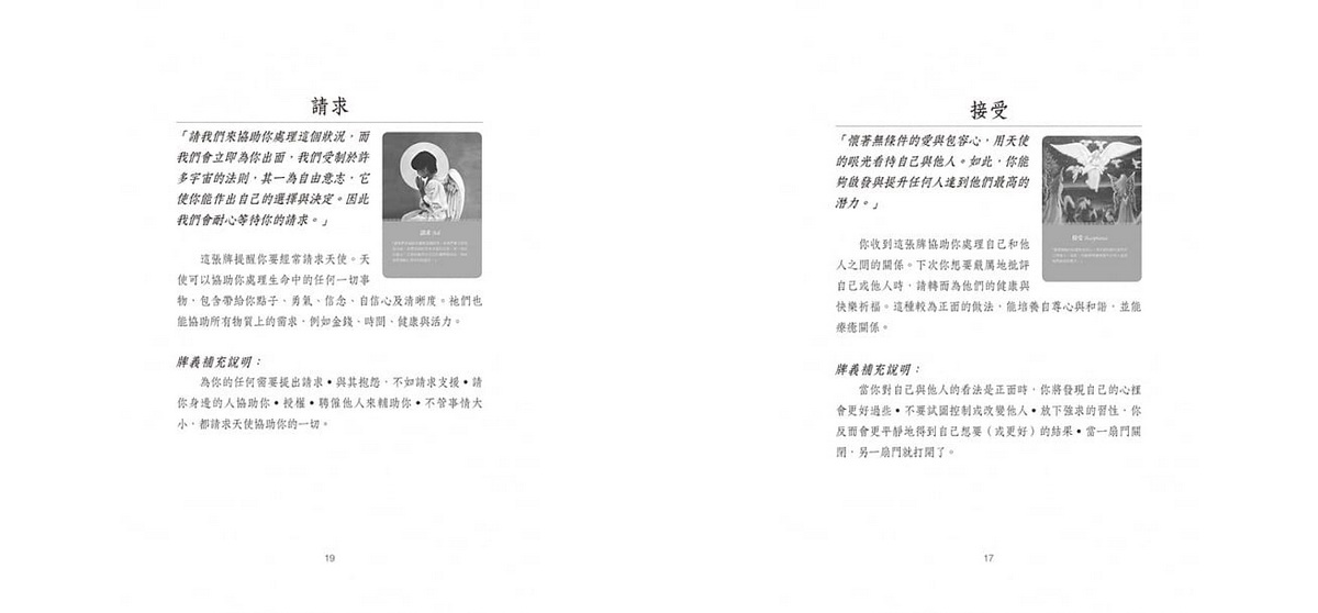 請與你的守護天使連結──在你的當下與未來,皆會受到祂們的庇護。你的守護天使將幫助你運用自身的天賦、熱情與喜好,協助你實現此生的生命目的,並帶著正向的意念去覺察自己與他人內在的光與良善,將自己提升到內在平靜及慈悲的更高境界。