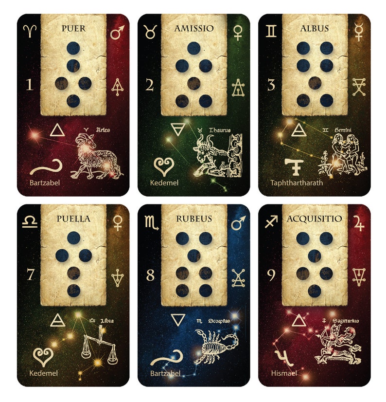 The cards depict Geomantic figures, Elements, Signs of the Zodiac, the Planets and the Sigils. The Sigils of the planetary spirits as used in Geomancy differ from the forms obtained by plotting their names on the planetary “magic squares".