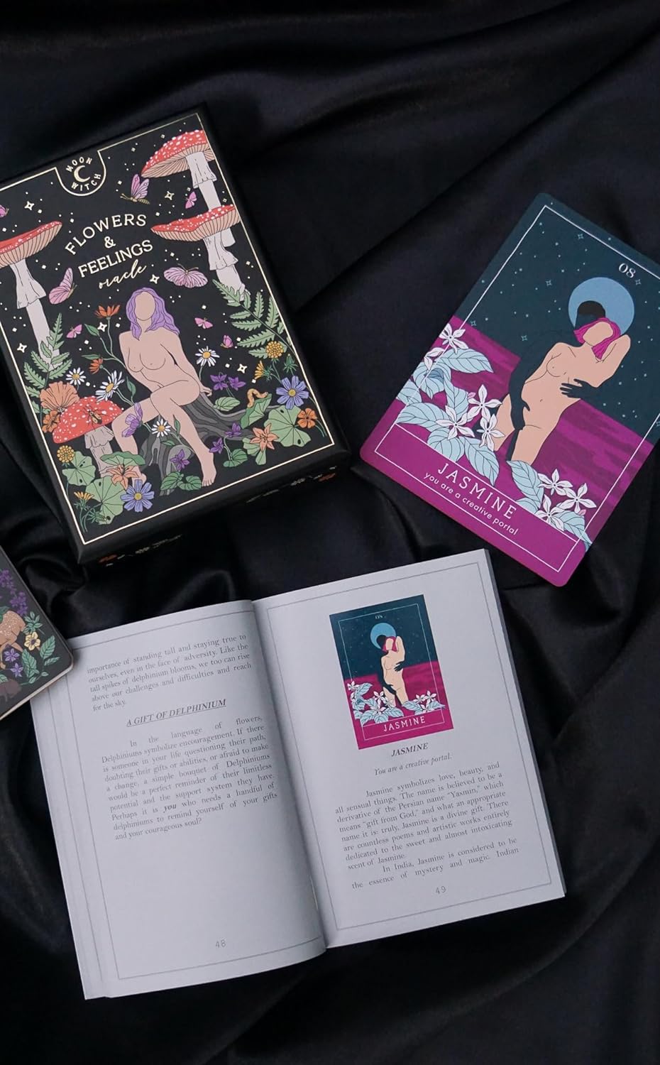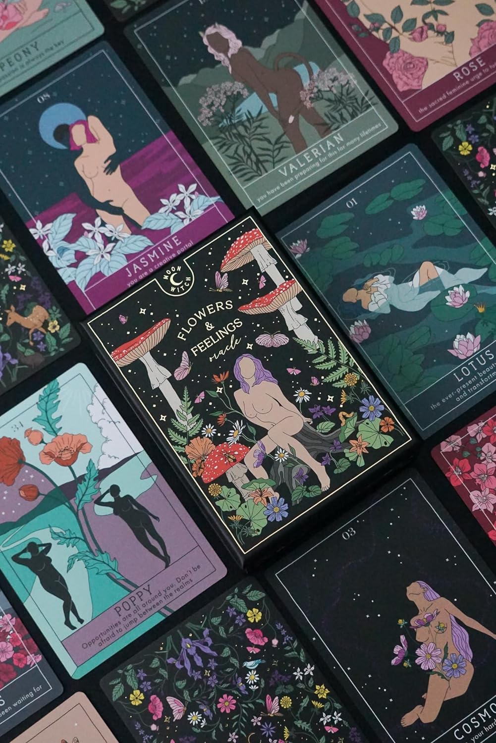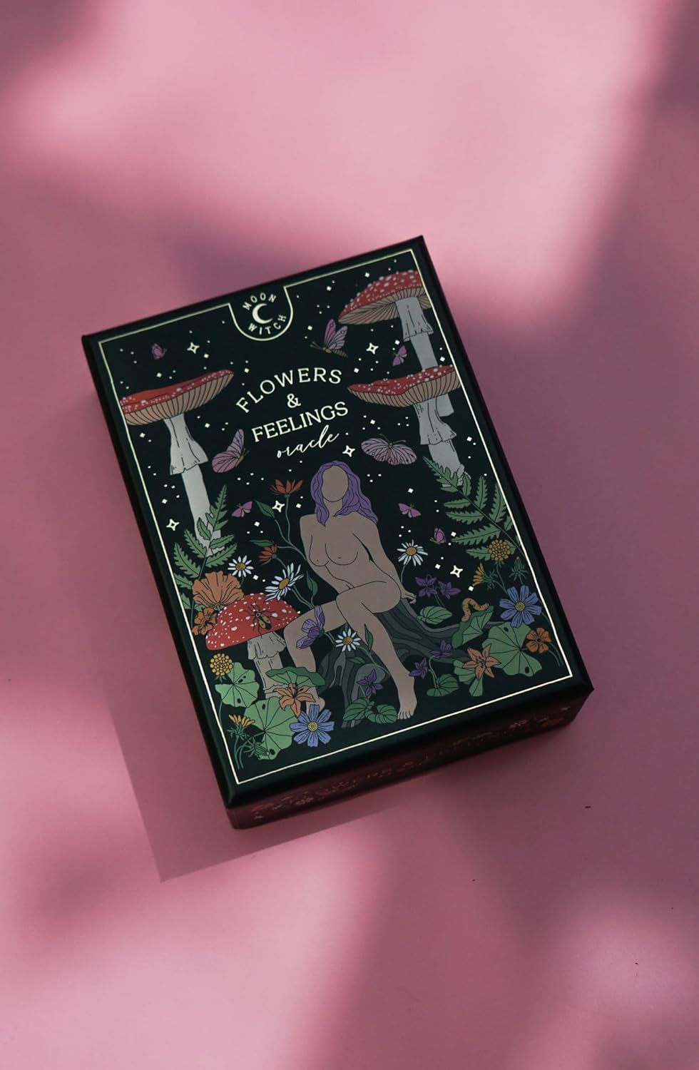 Moon Witch series presents a new oracle deck - Flowers and Feelings! Immerse yourself in a magical world of flowers and plants, where beauty, wisdom, and history all intertwine. Created in a garden, Flowers and Feelings Oracle Deck was inspired by legends across the world and the profound knowledge found within the petals, stems, and hearts of nature’s most delicate creations. Flowers and Feelings is not your traditional oracle deck. Despite the name, this deck features not only flowers, but trees, herbs, mushrooms, and goddesses of flowers and spring. Every card, flower, tree, and herb is not only here to provide guidance, but to inspire you to go outside; get to know every single bush, tree, and flower of your neighborhood, as well as the forest around; tap into your ancestral knowledge; recognize plants as your allies; and so much more. As you shuffle the deck, you will find yourself transported to gardens, jungles, and enchanted forests, where each flower and card become a mirror, reflecting parts of your consciousness back to you. Whether used as a tool for daily guidance or as a source of inspiration, Flowers and Feelings Oracle Deck offers a unique way to tap into your inner wisdom. It serves as a reminder of the ever-present beauty of growth and transformation, and nature’s unfailing ability to soothe our aching hearts.