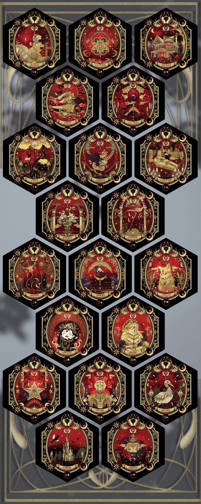 - Special Cards: Features unique "Raven", "Candle" and "Rabbit" cards, embodying the deck's thematic essence.
