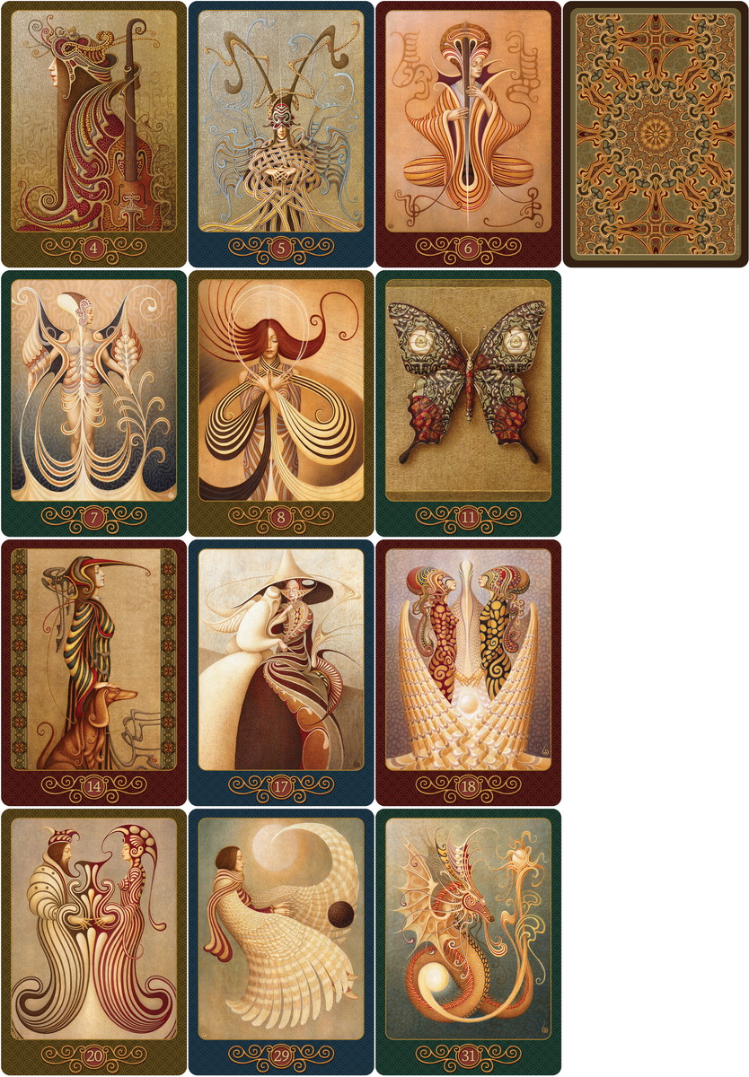 Inspired by ancient forms of dream divination, Russian fantasy artist Boris Indrikov created a uniquely captivating oracle deck. The beguiling artwork blends Boris’ signature surrealist flair with art nouveau elements that draw in the reader and ignite the imagination. The deck’s 40 main cards are divided into four color suits, with each group corresponding to a natural element and a sphere of human life. The bonus card is a special inspirational Joker. The illustrated 56-page guidebook offers oracular advice and empowering quotes.