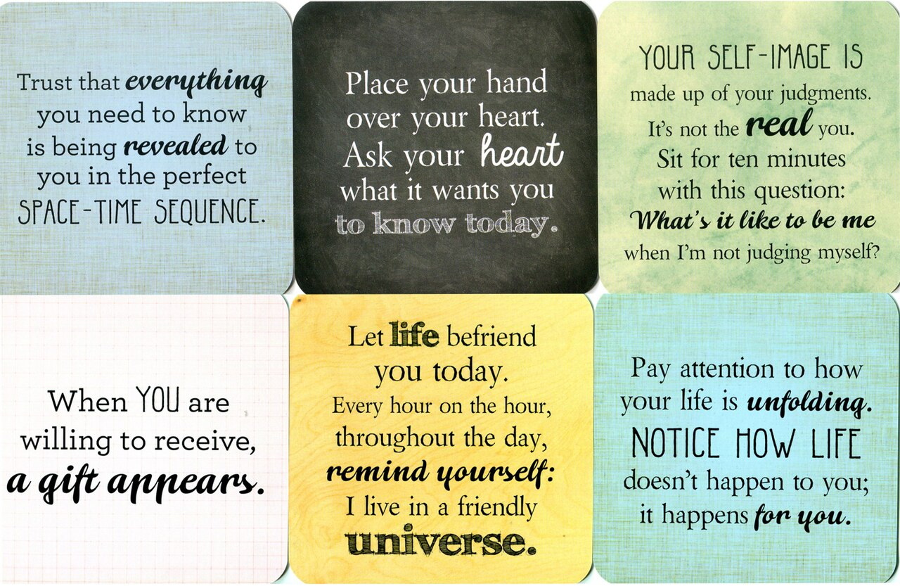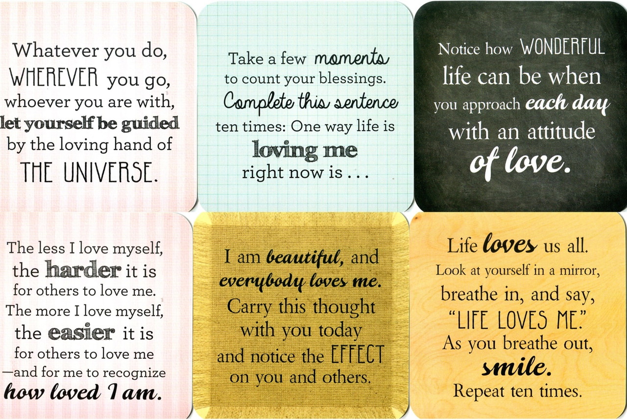 Each of the 52 cards contains an affirmation to practice on one side and on the other, an inspiring message to encourage self-inquiry and positive action. As an example, the card for the affirmation Life loves you contains the following text on the reverse side: Life loves us all. Look at yourself in a mirror. Breathe in and say 'Life loves me'. As you breathe out, smile. Repeat ten times.