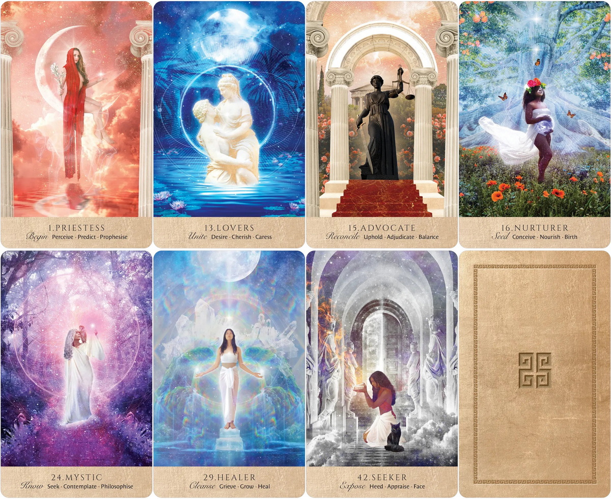 Product Descrpition: Here, on the threshold of wisdom, you can commune with ancient seers, reclaim miracles and free the future. Here, your questions invite guidance, magic and activations. This exquisite oracle is a portal to clarity and understanding. Shuffle the deck to invoke the eternal priestess, choose your cards and welcome wonder, healing visions and sacred empowerment. Includes 44 cards and 176-page full-color guidebook with navy-foil accents on box and guidebook cover.