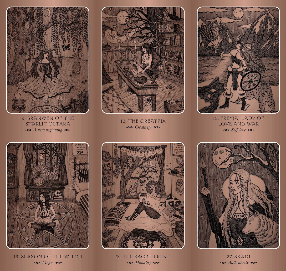 The images on the 44 cards depict strong feminine figures from mythology, folklore, and contemporary culture—all women who faced their own struggles and victories, and whose example will inspire others to discover their true self. The artwork was created in pen and pencil and reproduced in shades of black printed with bronze metallic ink to enhance their dark and mystical feel.