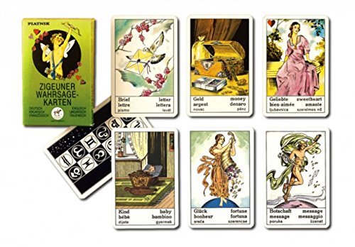 Gypsy oracle cards, also known as Gypsy fortune-telling cards, originated in Austria at the beginning of the 20th century. After Lenormand cards, Gypsy cards are the best-selling oracle cards of all time. The names of the individual cards are in six languages: German, English, French, Italian, Croatian, and Hungarian. The deck consists of 36 cards with brief instructions also in six languages.