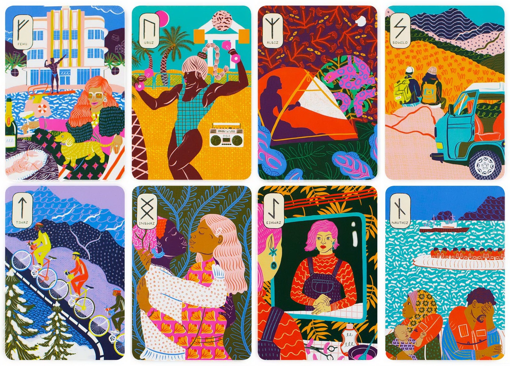 - 24 cards featuring a colorful contemporary illustration along with a symbol of the runic alphabet.