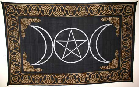 Product Descrpition: Marvelously woven of heavy, 100% cotton, this tapestry presents the central design of the silver pentacle symbol of the Triple Goddess. With a fringe around its borders, this symbol is set upon a black background and surrounded with an intricate pattern of Golden Celtic Knotwork at its borders. Hanging 72" by 90" it makes for a fantastic bed spread or decorative addition to your wall or ceiling.