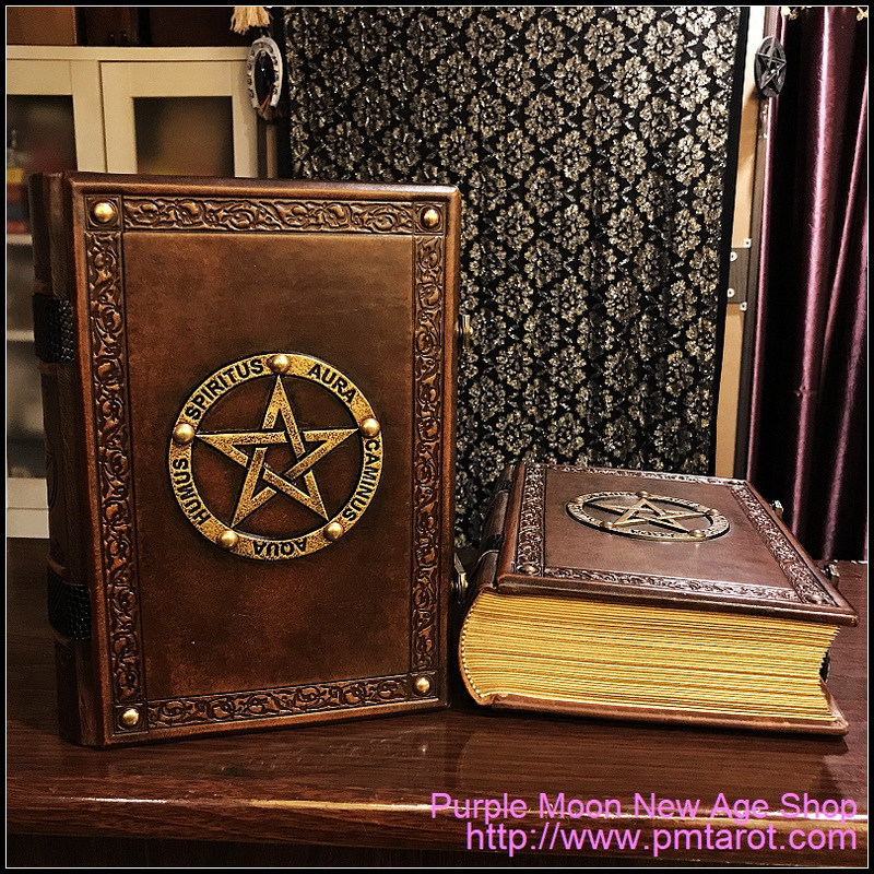 This Book Of Shadow has thickness of around 3 inches (8 cm). The front cover plate has a hand carved pentagram, surrounded with deep embossed frame. Leather is hand toned and aged in brown color tone. The book block has 300 leaves (600 pages) of special, thicker, cream toned vintage paper type in 140 gsm paper weight. Paper edges are gilded and aged.