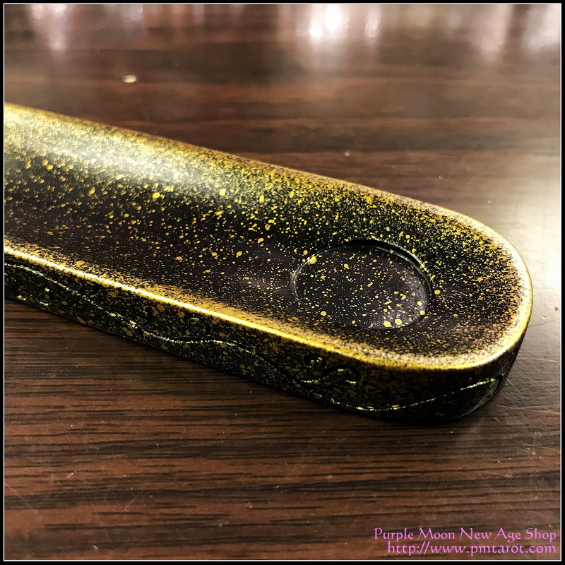Product Descrpition: 10" flat incense burner with a dyed amethyst piece on the end. Copper and black toned tray with carved branch designs on the size. Aura orange dyed amethyst piece on the end.