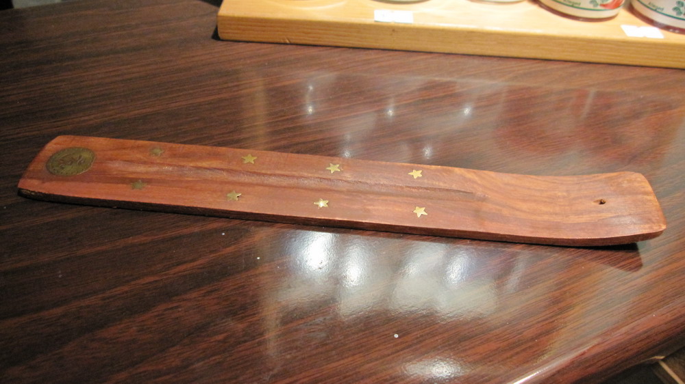 An elegant, yet function orientated design in wood with one end slightly angled as a holder for burning stick incense. Symbol variant.