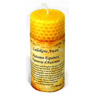 Gold beeswax pillar candle anointed with Autumn Equinox Anointing Oil. Use on the Autumn Equinox, and throughout the year to attune to the energies of balance between light and dark, with dark on the increase. Made on the day of the Autumn Equinox. Limited quantities available. Slight variations in colour may occur between batches.