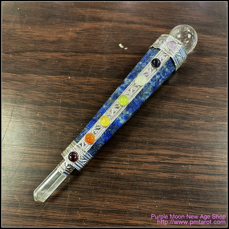 Product Descrpition: Created from a large, faceted piece of lapis, the 7 chakra lapis wand is a powerful tool of magic and healing, intended to help you direct energy and use it within your spells and crystal healing practice. Lapis. This large, faceted core of lapis is well known for possessing an energy that is said to help enhance one's energy, and offer wisdom to those who use it. Similarly, in healing, lapis is said to help develop a clear mind, enhancing intuition and understanding. This is further enhanced by a sphere of quartz at its back and a quartz point at its tip, used to gather and direct energy, as well as precious stones set along its length to represent the seven chakras, and help you cleanse, balance, and focus upon using these energy centers of the body.