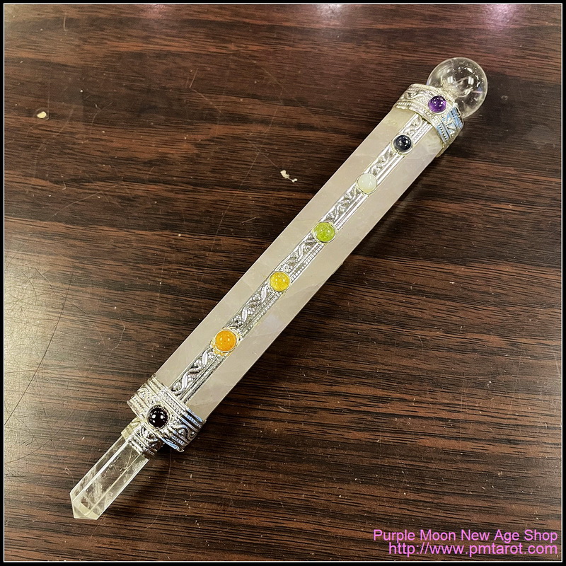 Product Descrpition: With the warm, pink tones of a faceted piece of rose quartz forming its core, the 7 chakra rose quartz wand is a wonderful ritual tool for healing emotional hurts, and invoking love within your spells and magic. Rose quartz is a crystal known for possessing an energetic quality that is nurturing to the heart, and as such it is often used in crystal healing to help mend heart break and all number of other emotional difficulties. Similarly, in magic it is a popular addition to love spells, where its warmth can help foster nurturing love and affection. This wand is wonderful for seeking this quality within your practice, and is only enhanced by a clear quartz sphere at its back and a clear quartz point at its tip, used to gather and direct energy. Similarly, it features seven precious stones set along its length, representing the seven chakras to help you clear, balance, and focus the energies of your chakras.