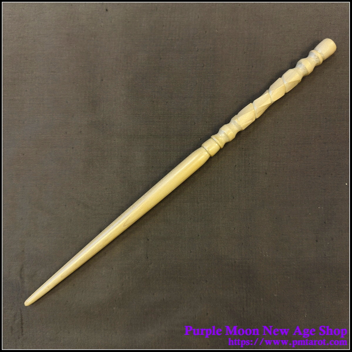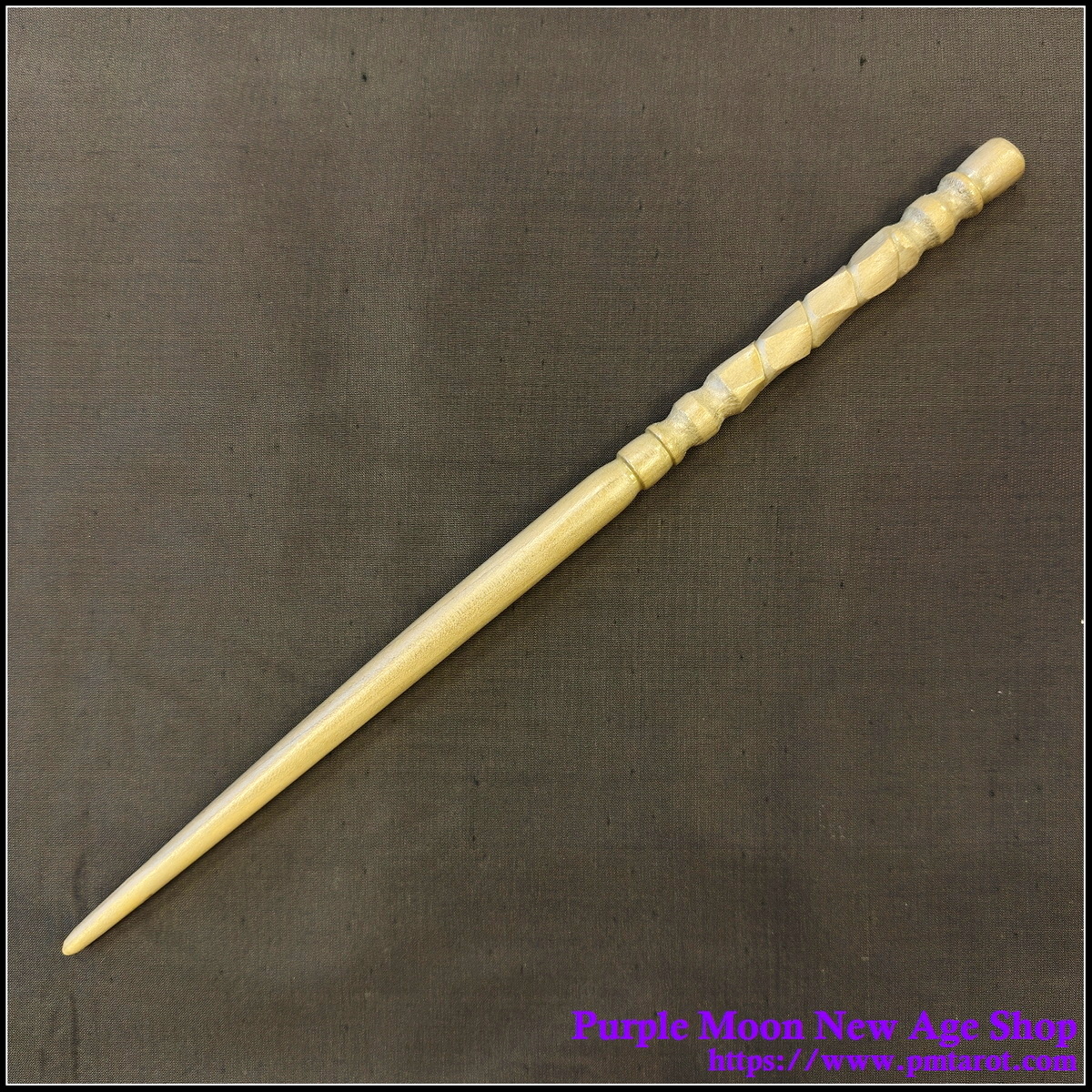 This wand is made from one piece of Birch, making it nice and sturdy for years of spellcasting. The handle has been given a solid dark stain; the tip has had the stain rubbed off, leaving the grain to show through.