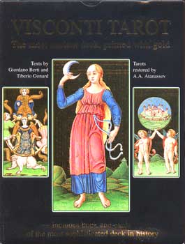 An absolutely stunning display of lavish gold foil and exquisite Renaissance art captured on 78 bits of card stock-pure magic and mystery! The shimmering gold plays with and reflects the light, seducing the intuition and delighting the eye. This deck is a treasure, truly a must-have for all Tarot students, enthusiasts, and collectors. Originally commissioned in 1450 by the Duke of Milan, and attributed to Bonifacio Bembo, this is a reproduction of the oldest extant Tarot deck, carefully reconstructed by Atanas Alexandrov. This deck is a combination of beauty and usefulness; the names (in five languages) and numbers appear in black borders that highlight the brilliance of the gold without detracting from the original design. Reminiscent of illuminated manuscripts and books of hours, these cards entice the curious with timeless archetypal images and the lure of echoes of historical figures (is that fair and vivacious noblewoman in the Queen of Swords Bianca Maria Visconti?).