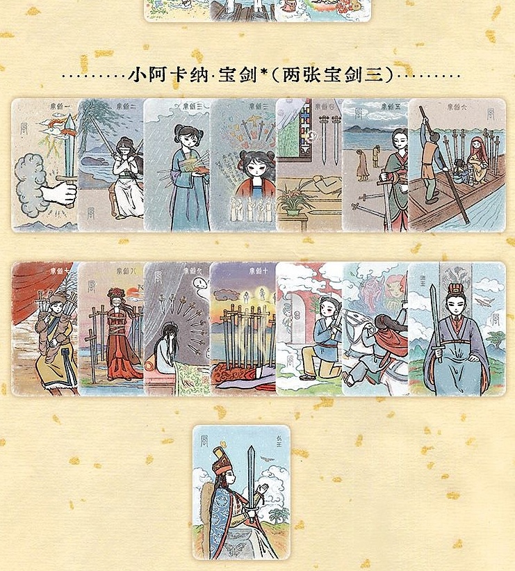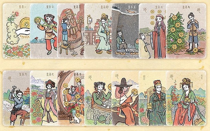 The artwork draws inspiration from "lianhuanhua" (连环画; a type of palm-size picture books popular in 20th-century China). Expect brushy lines, grainy colors, and lovingly hand-drawn clay dolls in vintage robes. Chinese folkloric motifs run throughout: lotus ponds, tiled rooftops, drifting mountain clouds... giving the deck a unique cultural warmth.