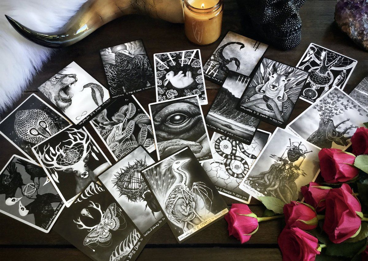 This an entirely self-published indie-deck that was hand-drawn in lead pencil over 4 years, with stunning artwork based on animals and the natural World. It is accompanied by a comprehensive guidebook that explains the artwork and Goliath's interpretation for each card. The cards and guidebook are presented in a custom-designed box, with a magnetic-clip, with luxurious deep-purple silk ribbon to lift the cards from the box. The cards are made with highly-durable 300 GSM card stock, coated with a protective UV film and finished with gold-gilding on the sides