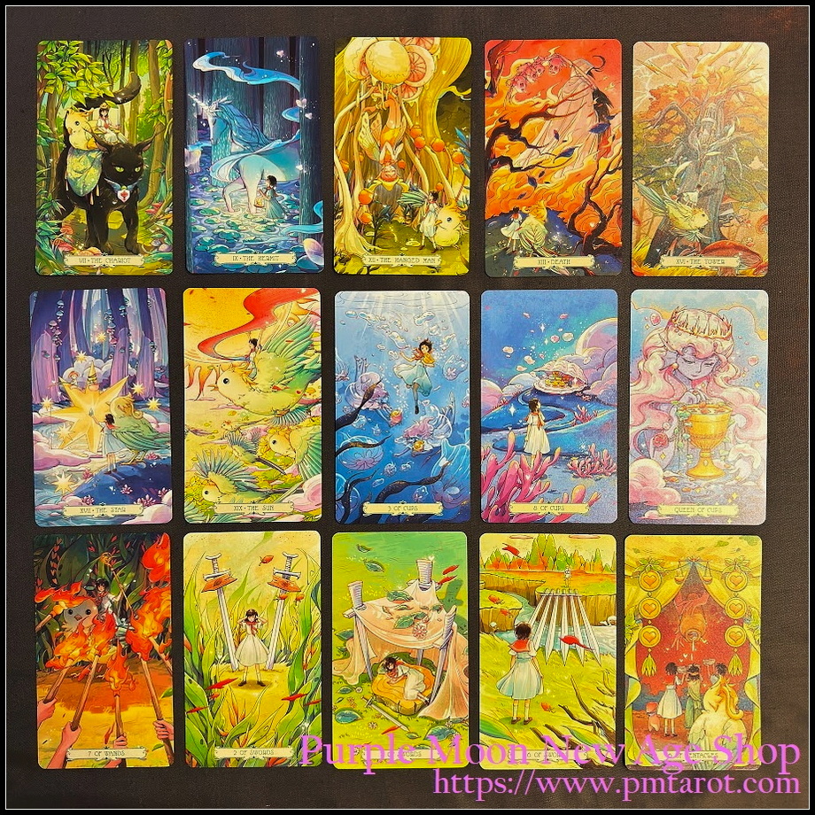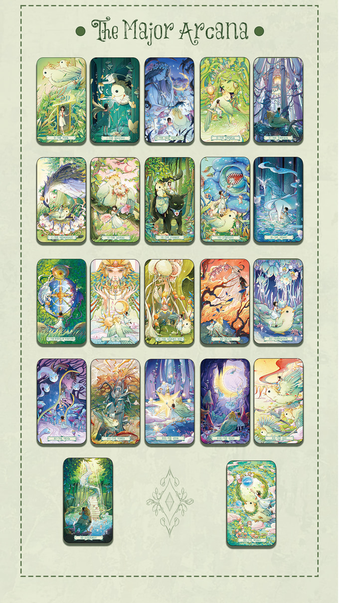 Flocks of birds nest atop ancient trees, and butterflies dance gracefully among the flowers. Angels patrol the land with compassion, while demons lurk in the darkness, feeding on greed and desire. The spirits, as embodiments of the forces of nature, faithfully follow their respective magical powers, together maintaining the balance and harmony of this world. Whether the gentle daytime or the eerie nighttime, all are expressions of the forest's unique charm. Every magical tarot card will record these wonders, attracting countless travelers to explore their mysteries.