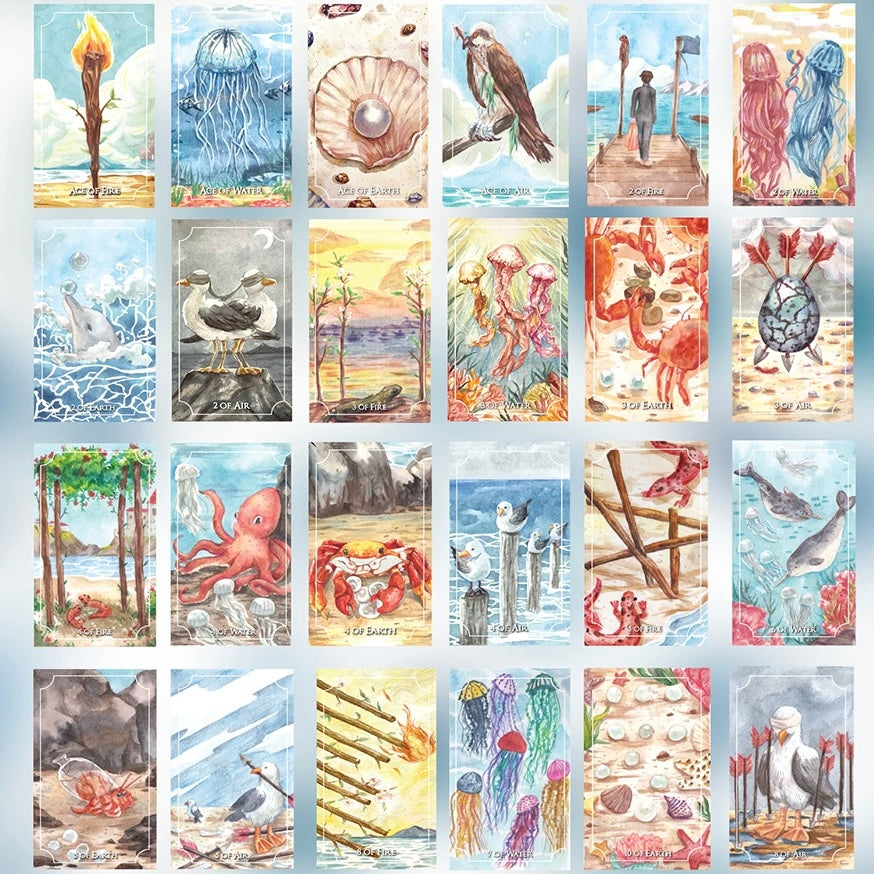 Product Descrpition: Dive into the healing power of the ocean with our exclusive Healing Waves Tarot deck. Illustrated with natural seawater and watercolor, this stunning tarot deck features an ocean-themed design that will transport you to a world of spiritual growth and renewal. Connect with your intuition and gain insight into your life's path as you explore the rich symbolism of the Tarot through the lens of the ocean. Perfect for both beginners and seasoned tarot readers, the Healing Waves Tarot is a powerful tool for healing, meditation, and self-discovery. Each card is infused with the energy of the ocean, offering a unique and transformative experience. Experience the magic of the sea and unlock your true potential with the Healing Waves Tarot.