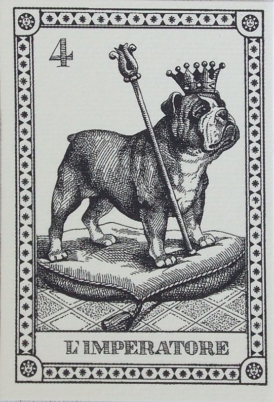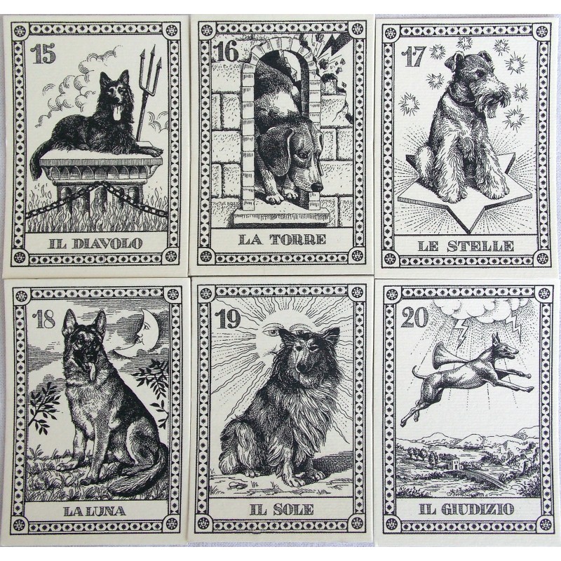 Product Descrpition: A numbered edition of 22 tiny black and white drawings depicting dogs in the traditional symbolism of the Major Arcana characters. Card titles in Italian. Printed on heavy ivory paper and packaged in a hardcover case with tie ribbon. A charming gift for dog lovers. This is the second edition limited to 2,000.
