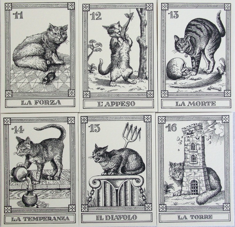 Product Descrpition: A limited edition series of 22 small black and white drawings depicting cats as traditional Major Arcana characters.