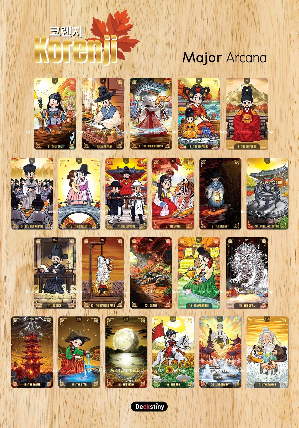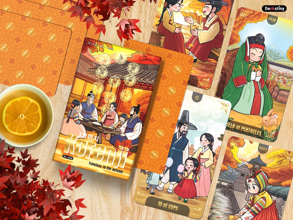 Joseon Korea-themed tarot cards bring the essence of autumn to life through exquisite artistry, reflecting the lifestyle, people, and nature of the era. Each card weaves a tale that blends culture, history, and the profound energy of divination.