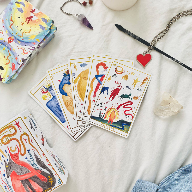 Every illustration was intuitively painted by hand with watercolors. Lilifer is a free-flowing deck with a unique voice. It takes root in various forms of the tarot and isn't attached to a specific school of thought.