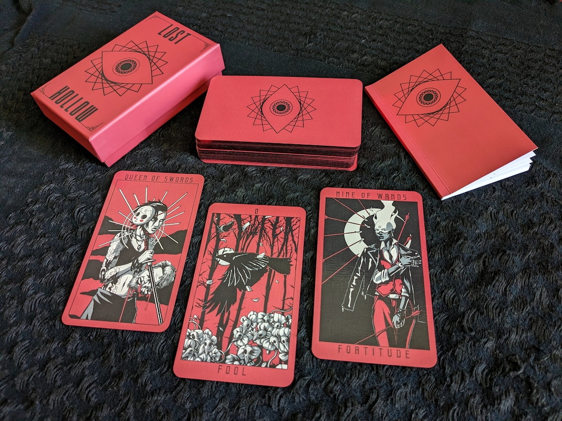 The Lost Hollow Tarot is a fully-illustrated 80 card deck printed at the standard Tarot size of 2.75x4.75" on casino quality linen card stock with black core and gloss coating, intended for durability, vibrant image reproduction, and ease of handling/shuffling. Each deck has red gilt edging to complete the high quality look even around the edges of the cards. Every deck is housed in a rigid two-piece box designed to provide protection and longevity even while you’re on the go, and comes with a booklet for quick reference.
