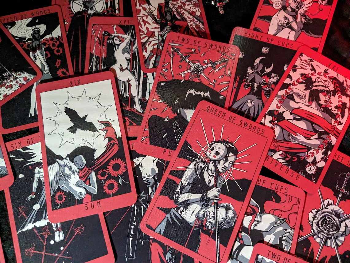 Each card is drawn in a red, black and white color scheme that keeps the whole deck unified in one consistent look and feel. The characters in the deck are a diverse cast that bring to life the varied beauty of the setting and its inhabitants. Every card meaning has a considered mediation between its different sources and as such you will see a melding of traditions.