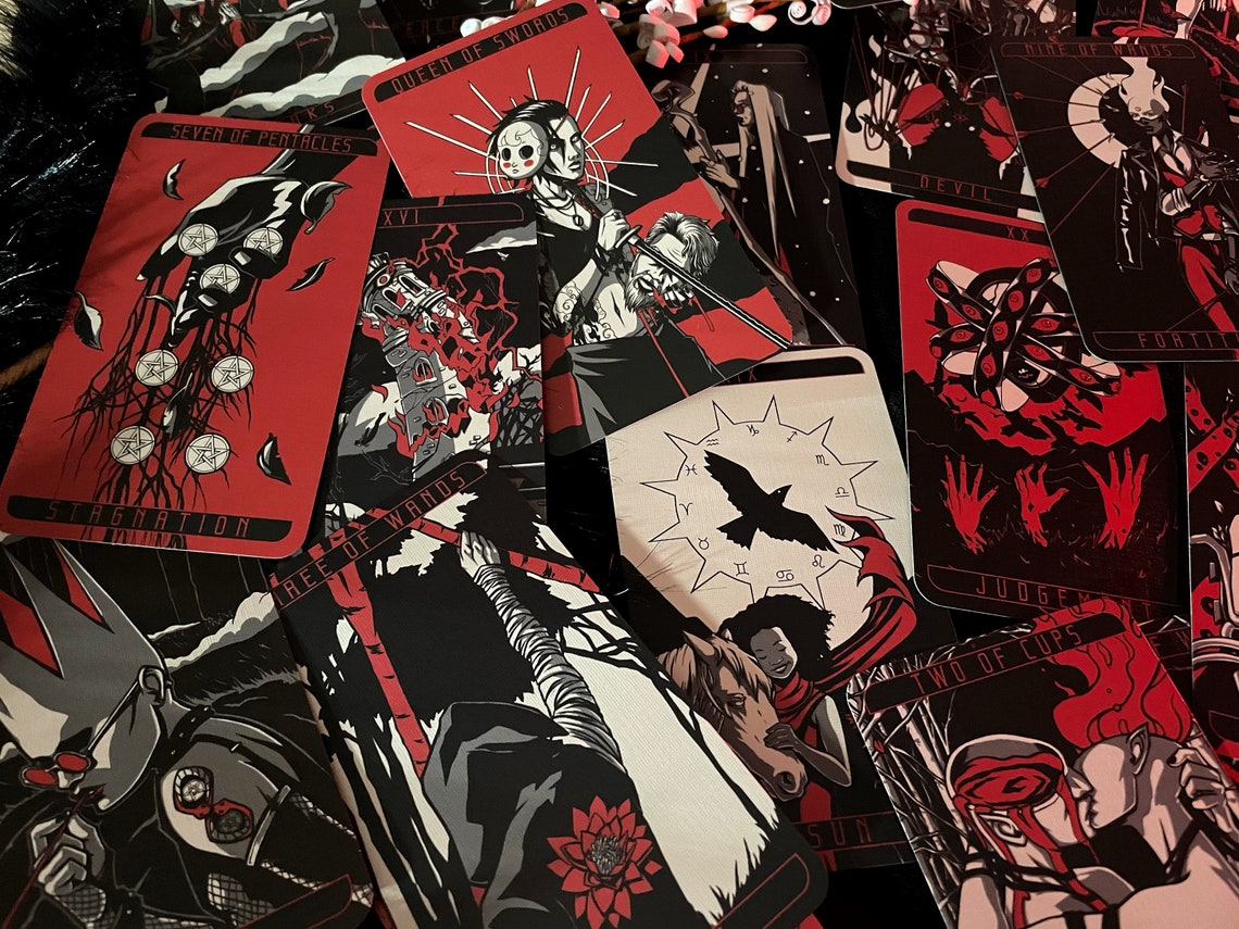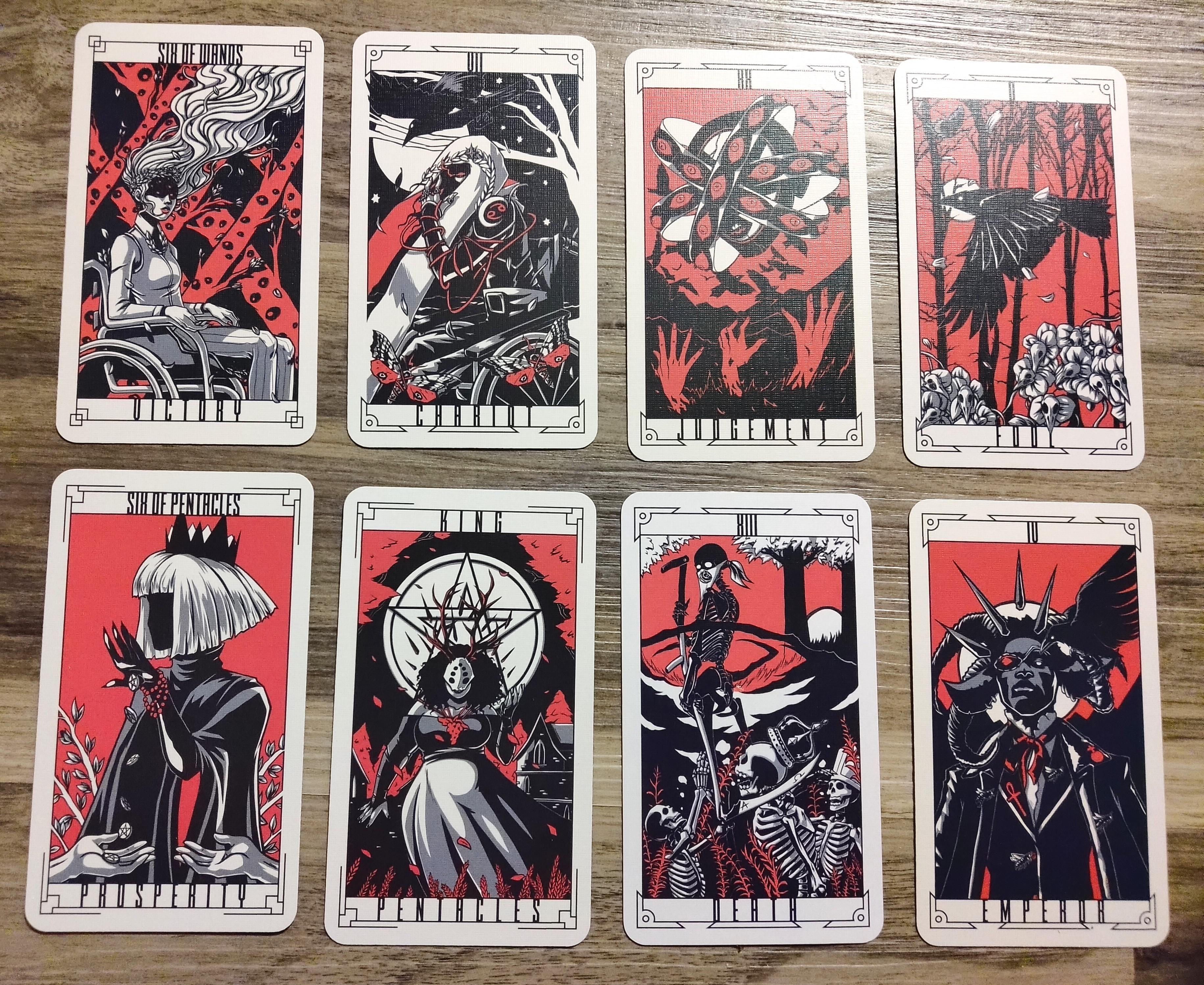 Each card is drawn in a red, black and white color scheme that keeps the whole deck unified in one consistent look and feel. The characters in the deck are a diverse cast that bring to life the varied beauty of the setting and its inhabitants. Every card meaning has a considered mediation between its different sources and as such you will see a melding of traditions.