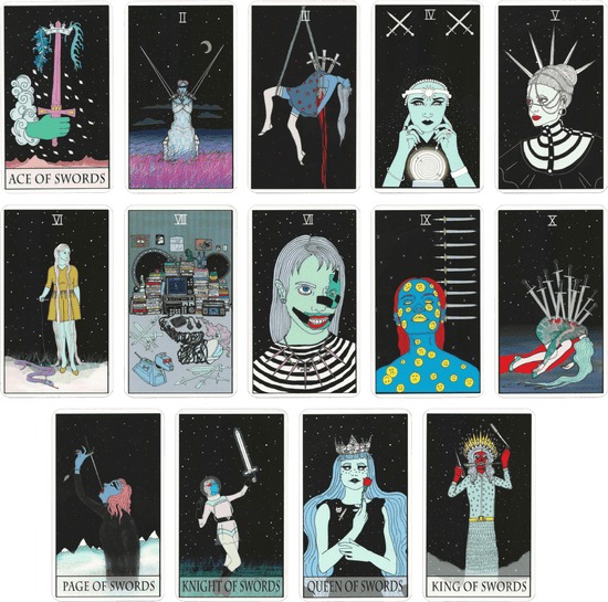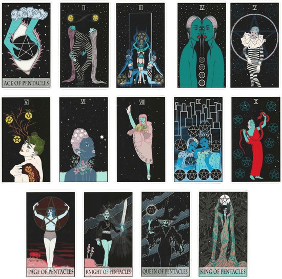 In Rider-Waite style, we see cups, wands, pentacles and swords, but each character has made their card their own, so you might have to search to find the suit!