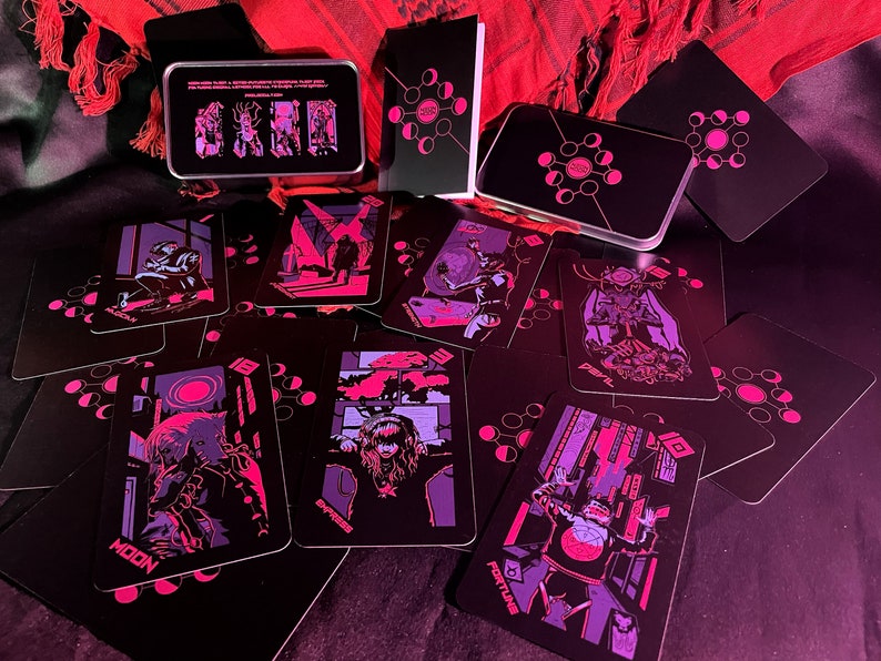 The Neon Moon Setting is my original take on a cyberpunk world, using the archetypes of the Rider-Waite-Smith Tarot. As with any Tarot deck, every card has a piece of story behind it, and every combination of cards tells a different story. Characters in the cards represent the wealthy yet repressed and restrained set in contrast against the poor but diverse and free that fight for their existence and identity against the many systems aimed at controlling them.