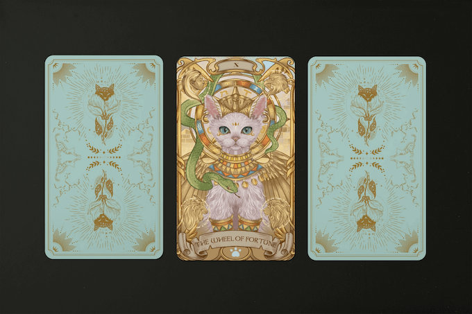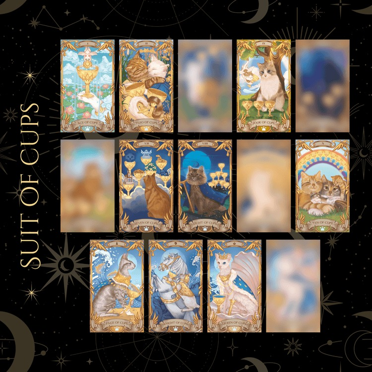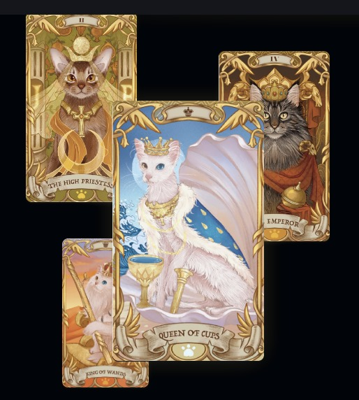 Product Descrpition: Enter the enchanting world of Nine Lives Cat Tarot and immerse yourself in the mesmerizing power of feline wisdom. This exquisite deck features beautiful artwork of cats, inspired by the traditional Rider-Waite Tarot, with each card offering a unique and enchanting interpretation of the tarot's timeless wisdom. The Nine Lives Cat Tarot comes packaged in a luxury magnetic box, providing a safe and stylish storage solution for your cards. Moreover, this divine deck includes a 170-page guidebook, filled with inspirational affirmations and profound upright and reversed interpretations of each card that will guide you in your daily life. Whether you're a seasoned spiritual seeker or a curious beginner, the Nine Lives Cat Tarot is a treasure that will unlock the mysteries of the universe and guide you towards self-discovery and transformation