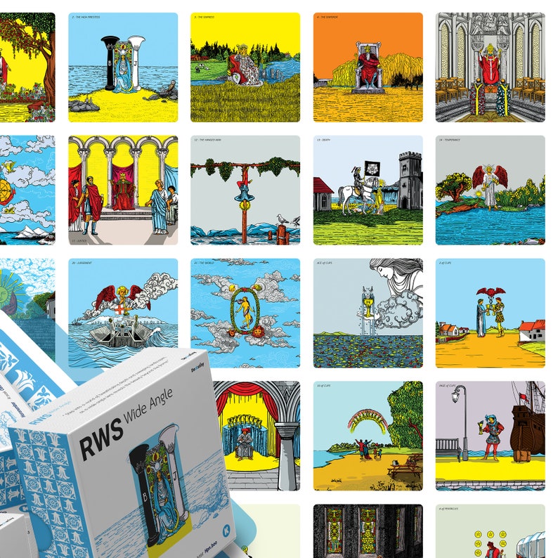 Wide Angle Tarot takes the familiar Rider Waite Smith Tarot and turns it into something truly remarkable. Think of it as using a special lens that lets you see beyond the edges, revealing breathtaking details and stories that were previously unseen. With every card, a world of beauty is waiting to be discovered, inviting you to explore the Tarot in a way you've never imagined.