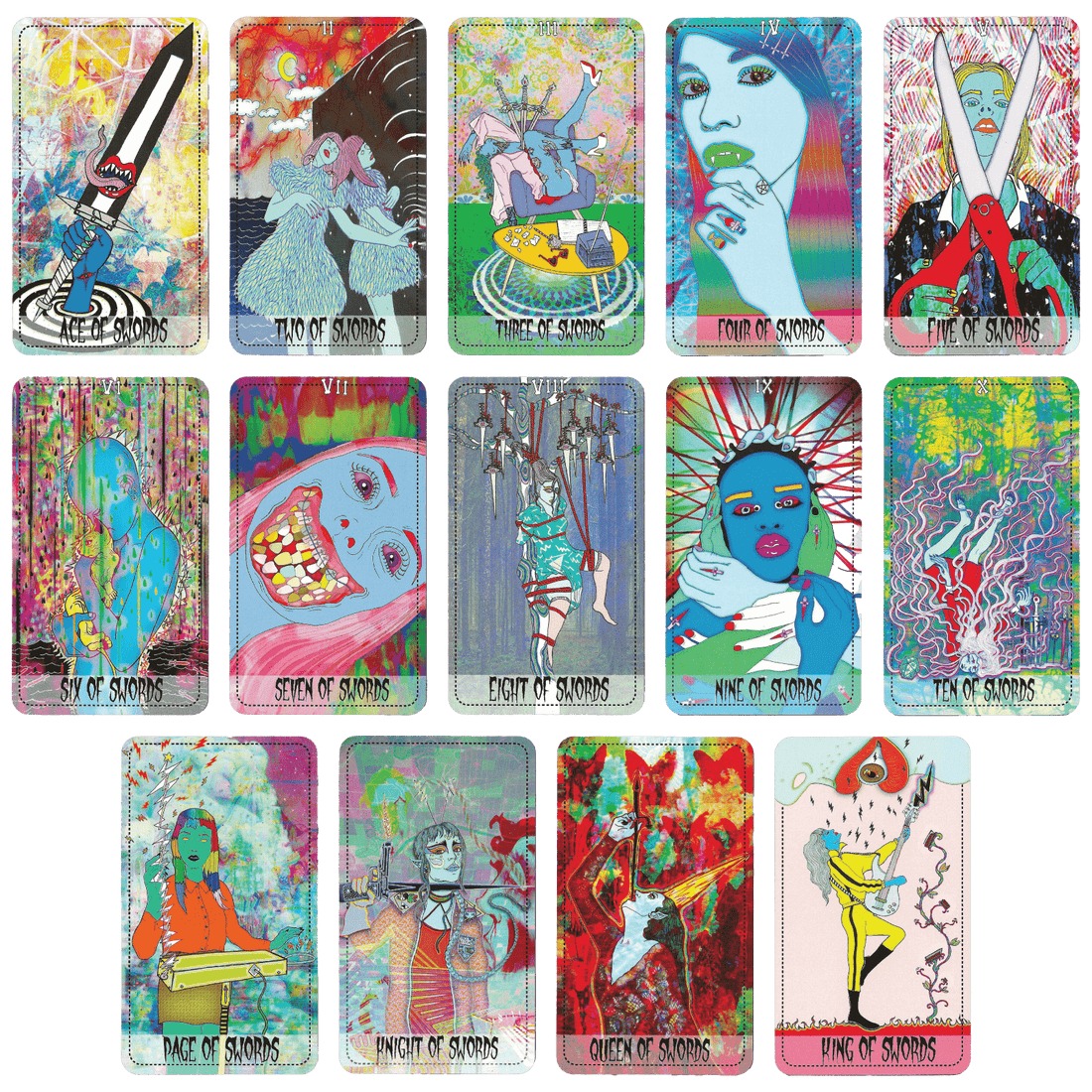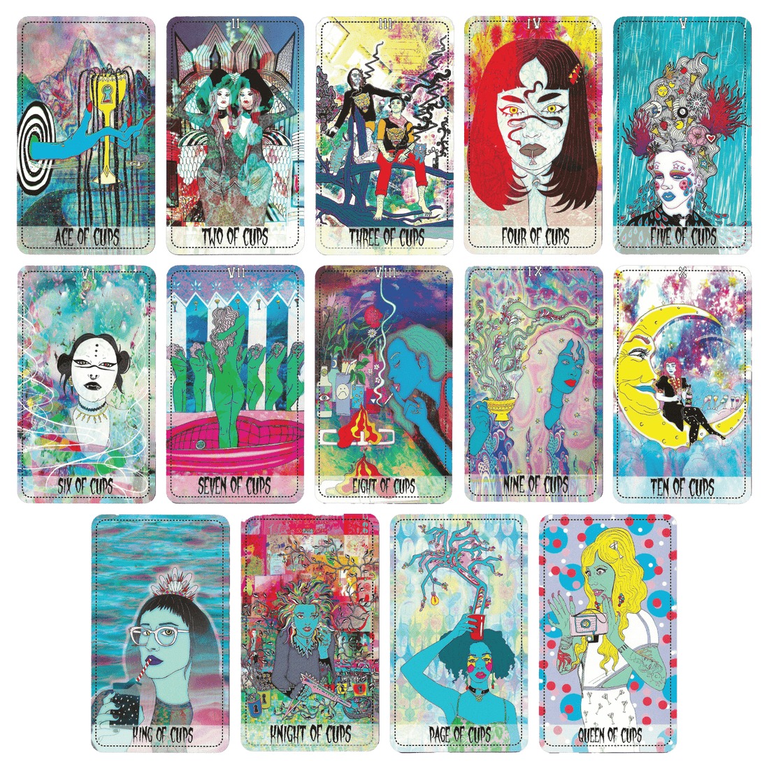 In Rider-Waite style, we see cups, wands, pentacles and swords, but each character has made their card their own, so you might have to search to find the suit!