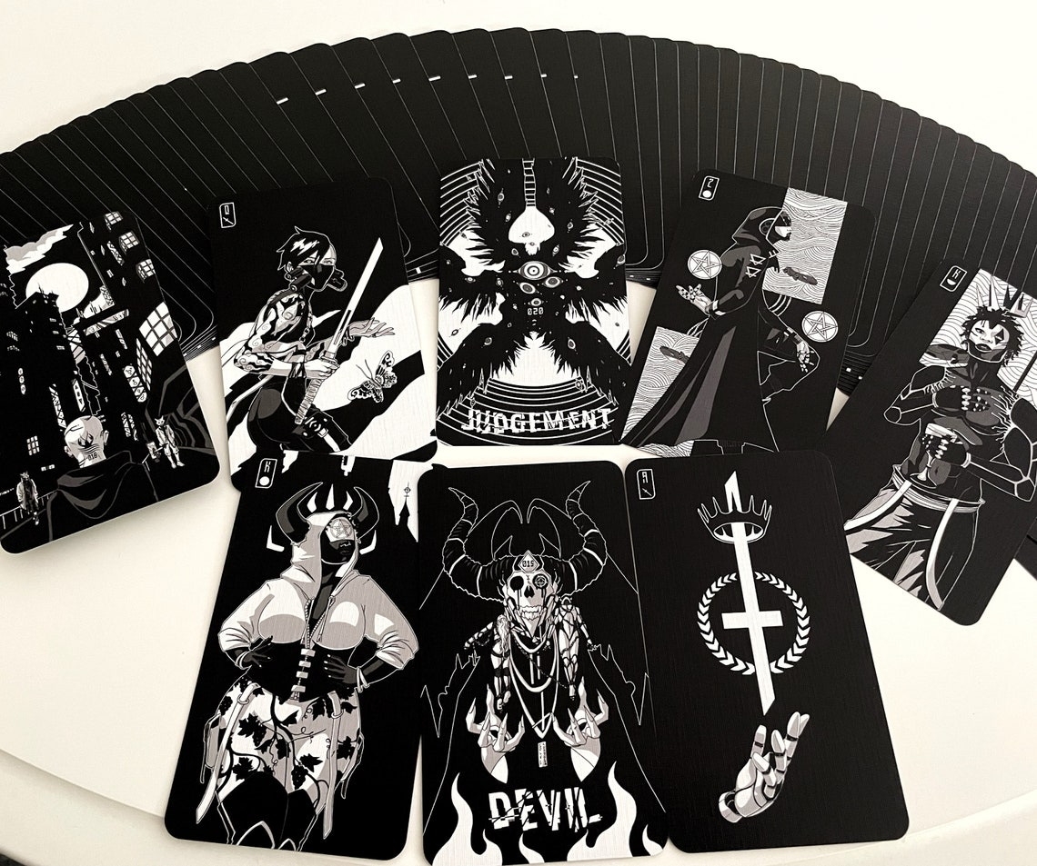 Here you will find all cards fully-illustrated with a rich and diverse cast of characters. Despite the dark setting, the contents of the deck read with the variety of light and dark themes and archetypes you'd expect from a Tarot deck. Cards ask you to read energy and themes and aren't tied to following specific gender expressions. The characters within are varied in their bodies, races, ages, sexual orientations, and genders.