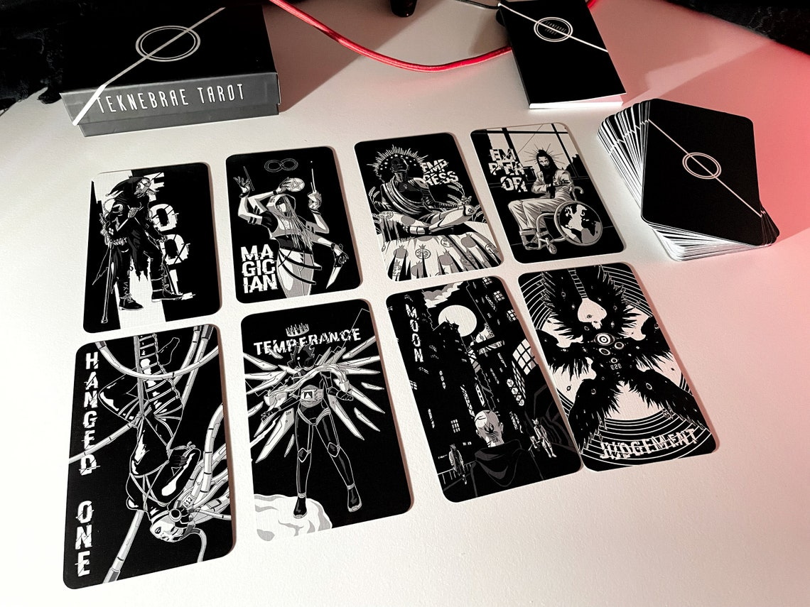 The Teknebrae Tarot is a fully-illustrated 78 card Tarot Deck printed at the standard Tarot size of 2.75x4.75" on master quality linen card stock with black core and matte coating, intended for durability, vibrant image reproduction, and ease of handling/shuffling. Each deck is housed in a rigid two-piece box designed to provide protection and longevity even while you’re on the go, and comes with a booklet for quick reference.