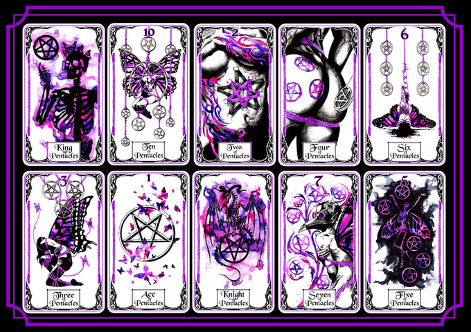 Product Descrpition: The second in my Bound tarot series, the FaeBound Tarot was hand drawn in black and purple ink, with watercolor accents. As always, I work in traditional mediums before scanning and putting the cards together.