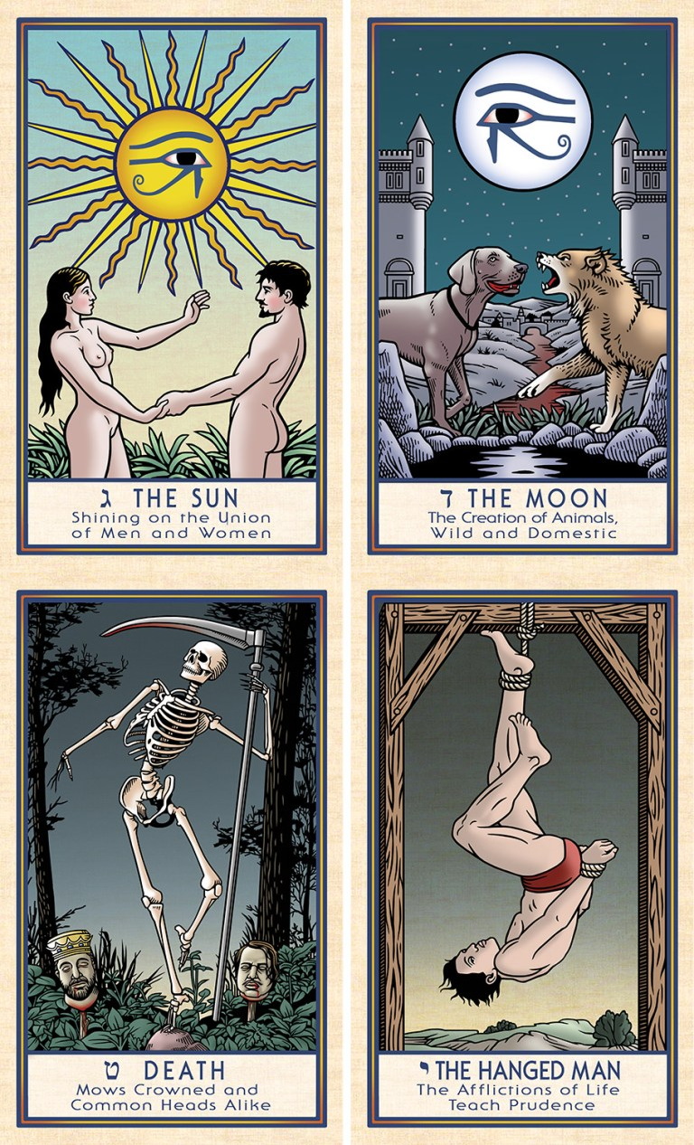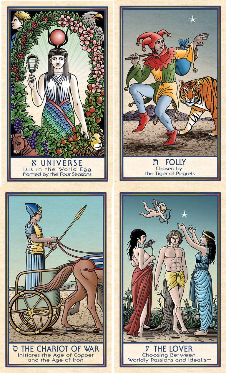 The Age of Gold begins with Trump Twenty-one, the World or the Universe, depicting Isis in the center of the egg of time with the symbols of the four seasons in the corners. Then comes Judgement, depicting Osiris creating humans from Earth.