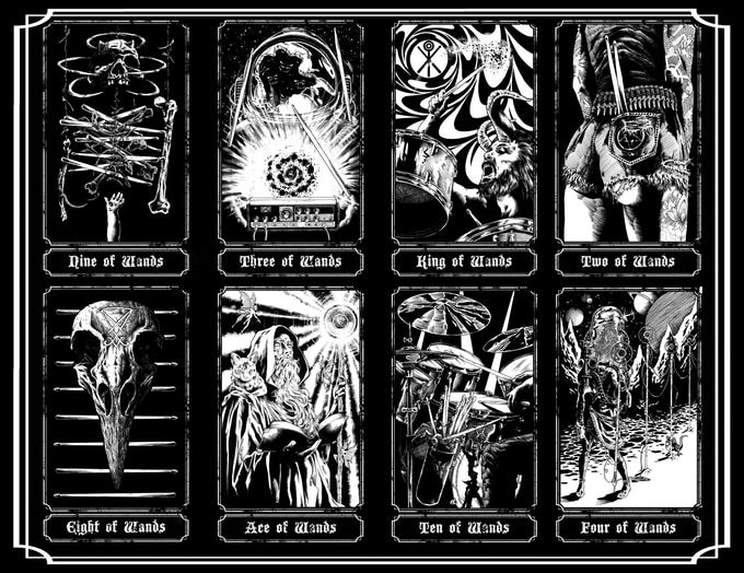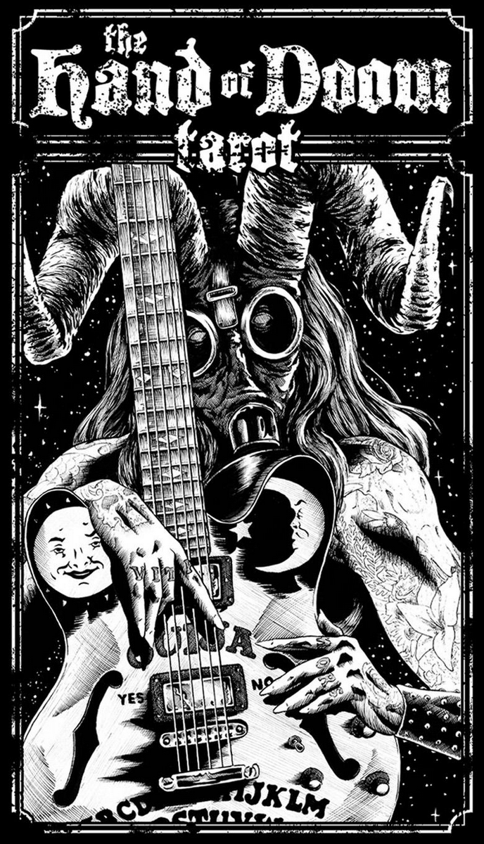 Product Descrpition: The Hand of Doom tarot. A 78 card tarot deck based on the classic Rider-Waite arcana but featuring brand new Doom Metal and Dark Fantasy themed artwork. Guitars and amps compete with monsters and magic to determine your fate. Tattoos and Fae, Werewolves and Whiskey, Science Fiction mixed with Sorcery. Saddle up a Chopper or saddle up a Dragon, spark one with a Goblin, lay down some tracks in the upper atmosphere with a Supernaut. Pure 70s Pulp is represented in each card. Follow the smoke to the riff filled land.