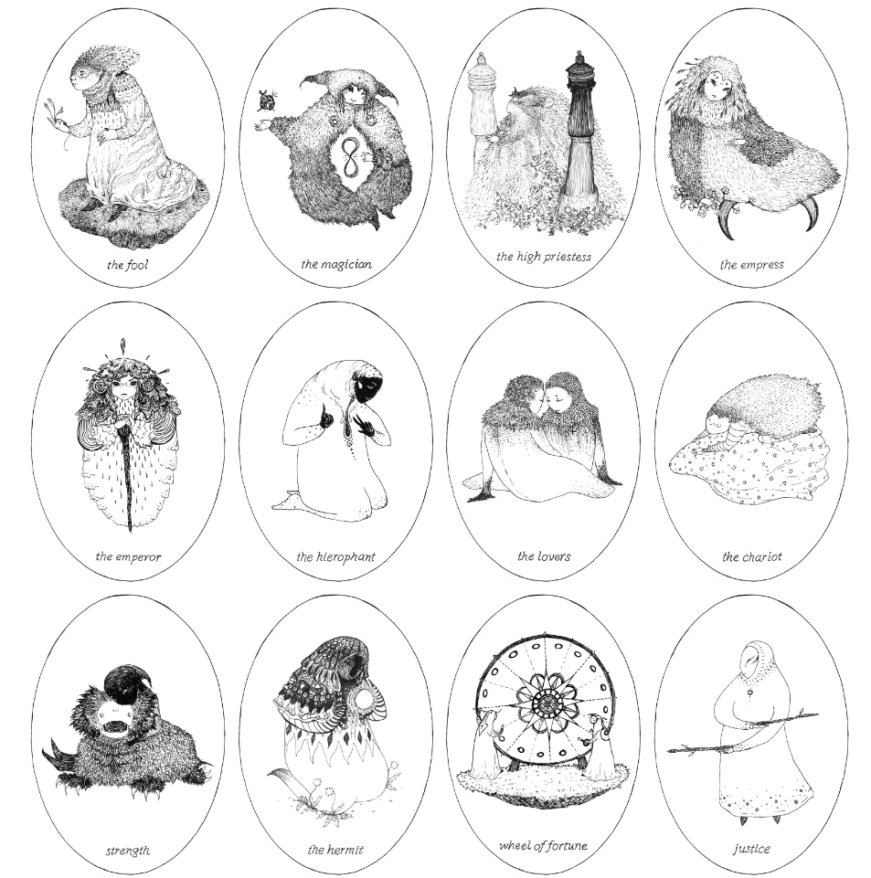 - A 78-card black & white Tarot Deck illustrating all manner of monsters in the Major and Minor Arcana with a guidebook containing folklore, history and traditional associations found within the Tarot and the Little Monsters deck.