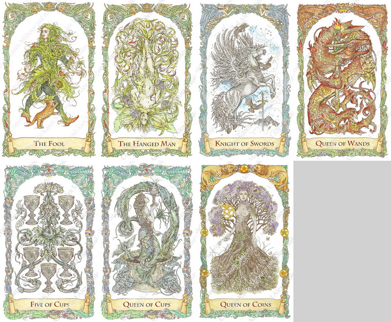 The images are painstakingly drawn in pen and ink by the brilliantly talented Russian artist, Lena Kozachuk, with a great deal of input and image editing by Alex Ukolov. It has been a real partnership, with both enhancing the skills of the other. Karen Mahony designed the concept and structure of the deck.