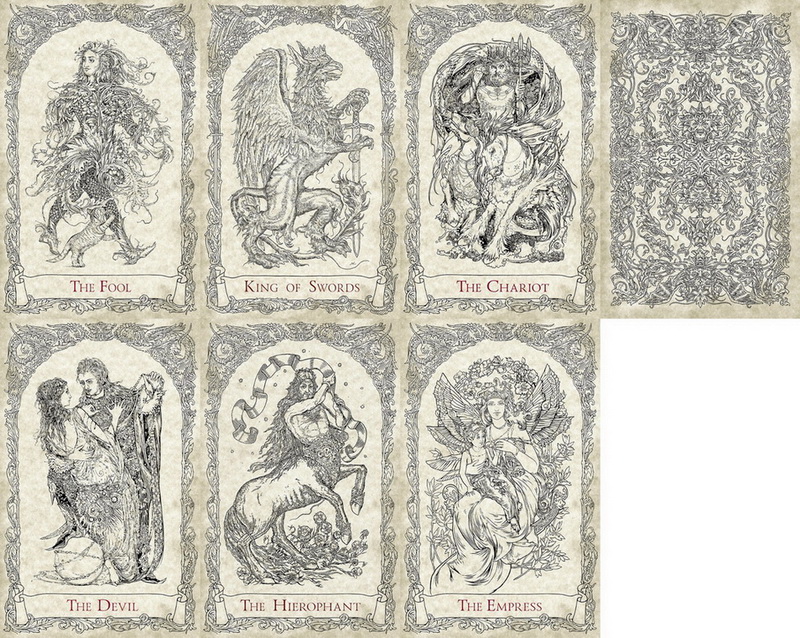 - Majors and courts each have an illustration of a mythical creature. Minors (pips) have highly decorative illustrations and show the suit symbols.